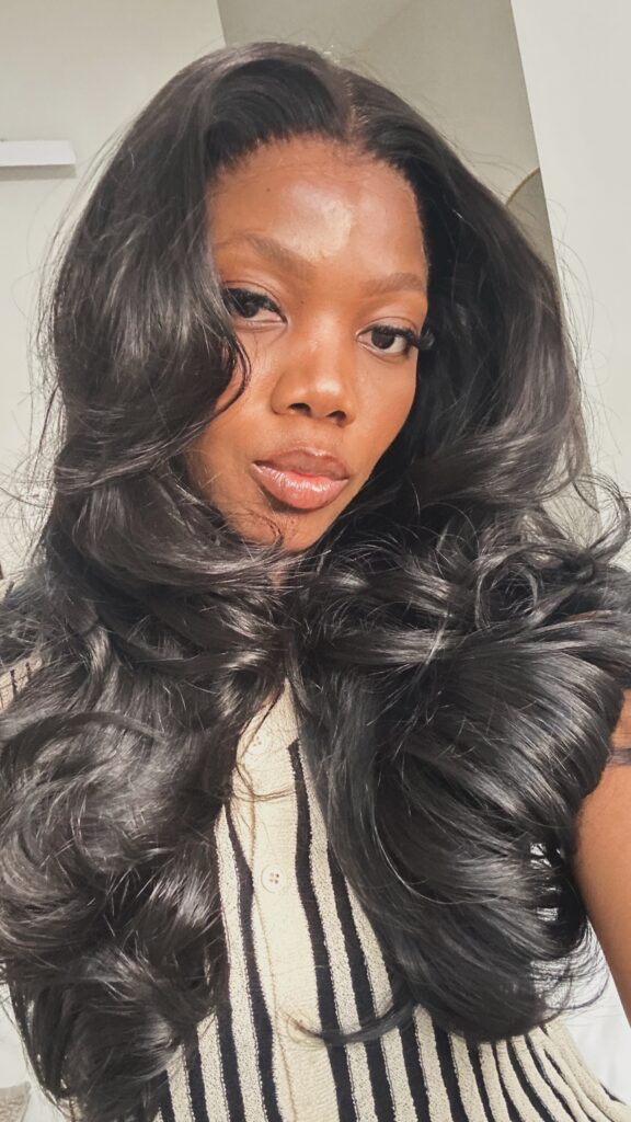 – natural straight with minimal & bangs – suggested styling using an airbrush or 38/40 mm curler)